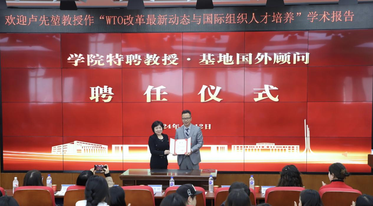 报告会后,国际经济贸易学院院长关嘉麟为卢先堃颁发了Beat365唯一官方网站国际经济贸易学院特聘教授、吉林省社会科学重点领域(吉林省对外经贸发展)研究基地国外顾问聘书。