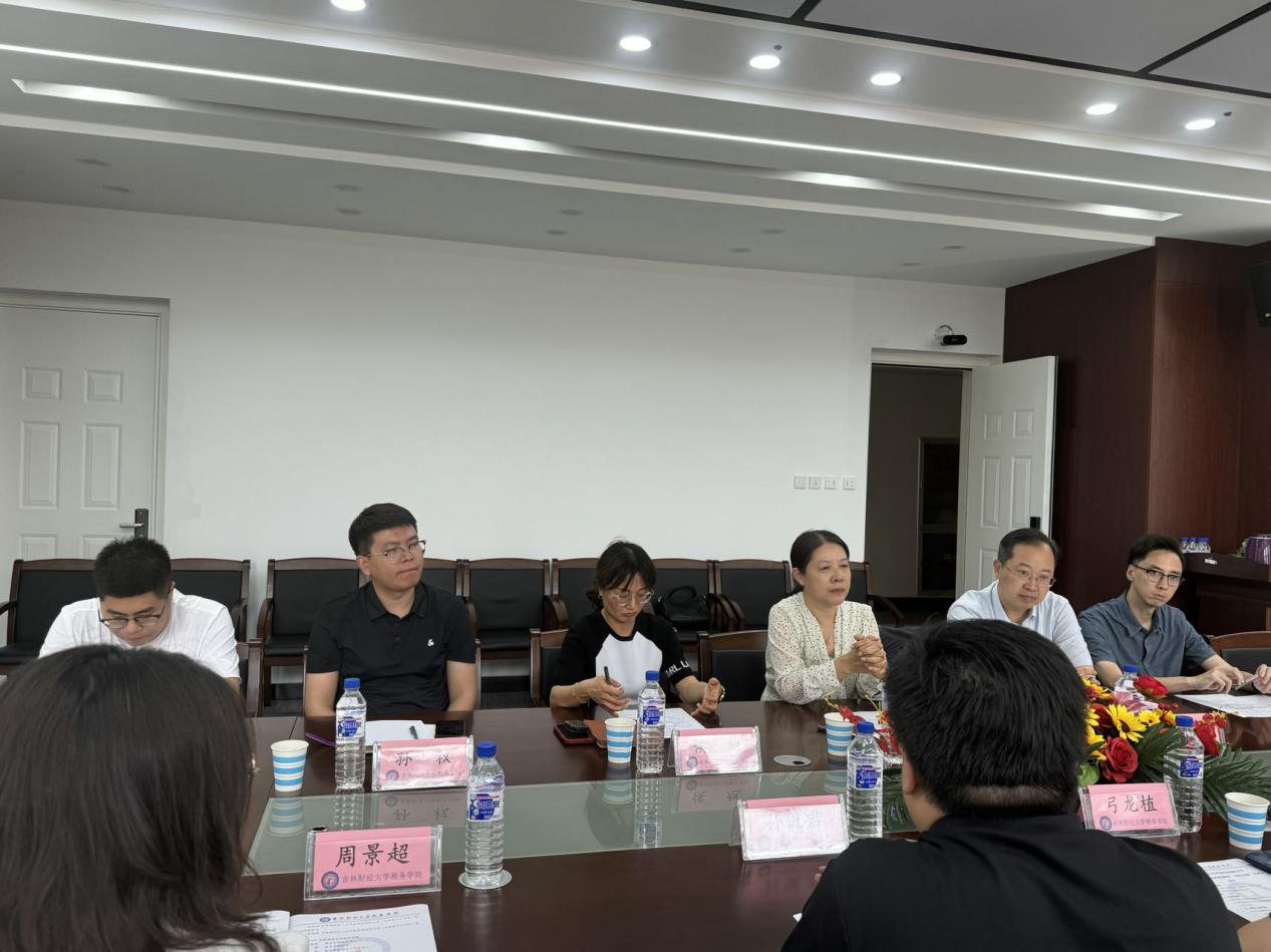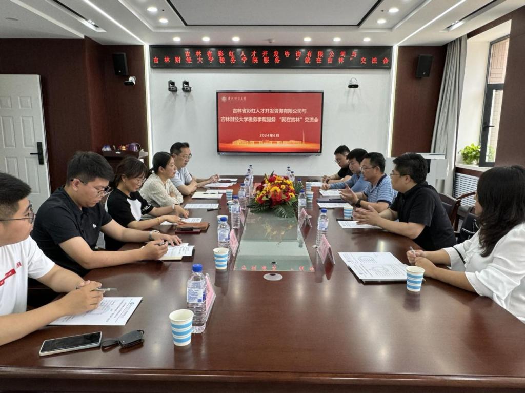 税务学院党委书记陈德民向弓龙植一行介绍了学院概况及毕业生就业情况,分析了当前就业形势,并希望通过双方的深入交流共同为“就在吉林”、振兴吉林作出努力。弓龙植介绍了彩虹公司服务“就在吉林”的工作内容和成效,同时希望通过与税务学院的交流,更精准地了解学生的岗位需求,为毕业生提供更专业的求职服务,更好地服务吉林高质量发展。