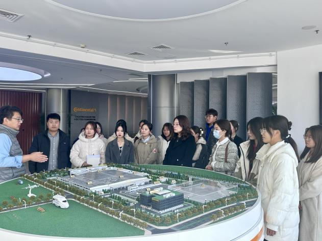 大陆汽车电子(长春)有限公司总监曹小康首先带领师生们参观了企业沙盘,细致地讲解了公司生产的具有代表性的汽车零部件功能及应用场所。随后曹小康为大家介绍了大陆汽车电子(长春)有限公司净月工厂的发展历程、集团组织架构与企业文化。大陆汽车电子(长春)有限公司经理刘迪针对财务方面向我院师生讲述了公司内部相关工作的具体内容,以及对实习生的要求。
