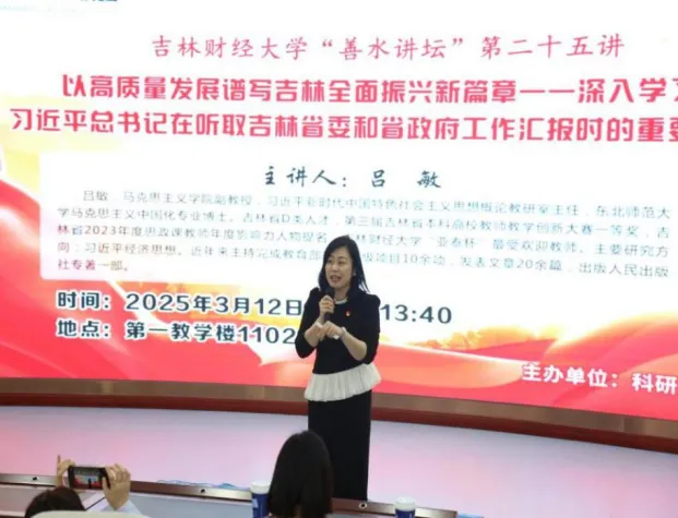 本网讯(科研处 供稿)3月12日,为深入学习贯彻习近平总书记在听取吉林省委和省政府工作汇报时的重要讲话精神,科研处联合马克思主义学院举办了“善水讲坛”第二十五讲学术活动。马克思主义学院副教授吕敏作了题为“以高质量发展谱写吉林全面振兴新篇章——深入学习贯彻习近平总书记在听取吉林省委和省政府工作汇报时的重要讲话精神”的学术报告。