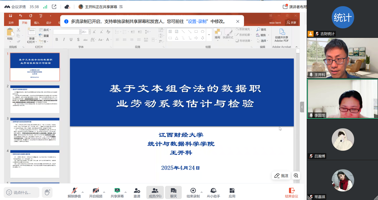 本网讯(统计学院 供稿)4月24日,统计学院邀请江西财经大学统计与数据科学学院王开科教授作题为“基于文本组合法的数据职业劳动系数估计与检验”的线上报告。