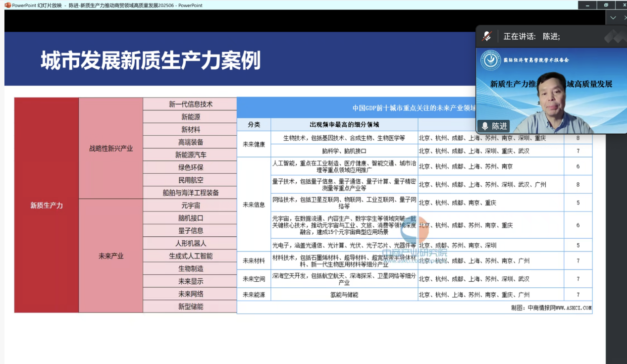 本网讯(国际经济贸易学院 供稿)6月4日,国际经济贸易学院邀请对外经济贸易大学陈进教授,通过线上方式为全院师生作题为“新质生产力推动商贸领域高质量发展”的学术报告。