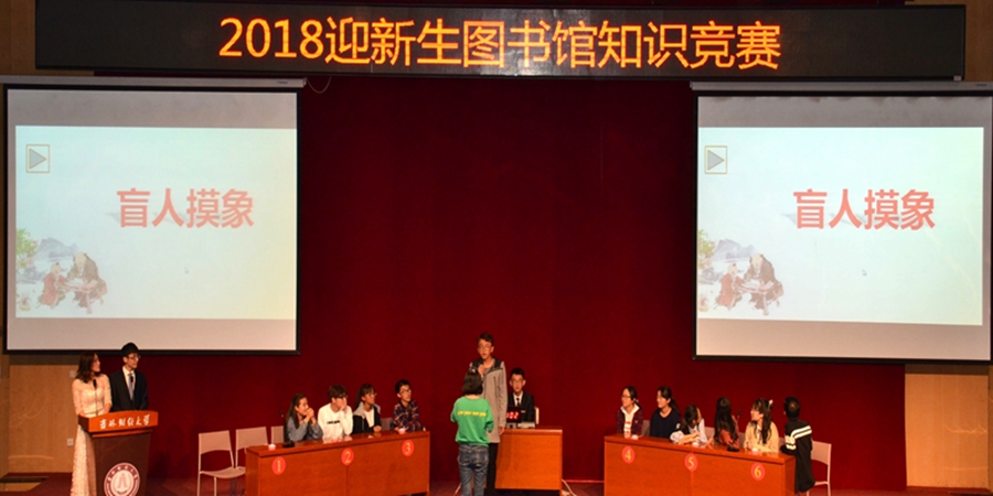 新生图书馆知识竞赛环节在朱雪刚副馆长的精彩致辞后拉开帷幕。经过初赛和复赛,12位选手过关斩将,脱颖而出,最终组成6个代表队,进行最后的冠军角逐。决赛共设置有“实力对决”、“急中生智”、“心有灵犀”和“一念之间”等几个环节,选手们随机应变,机智作答。答题中图书馆相关的知识,也使在场的新生们加深了对图书馆的认识。