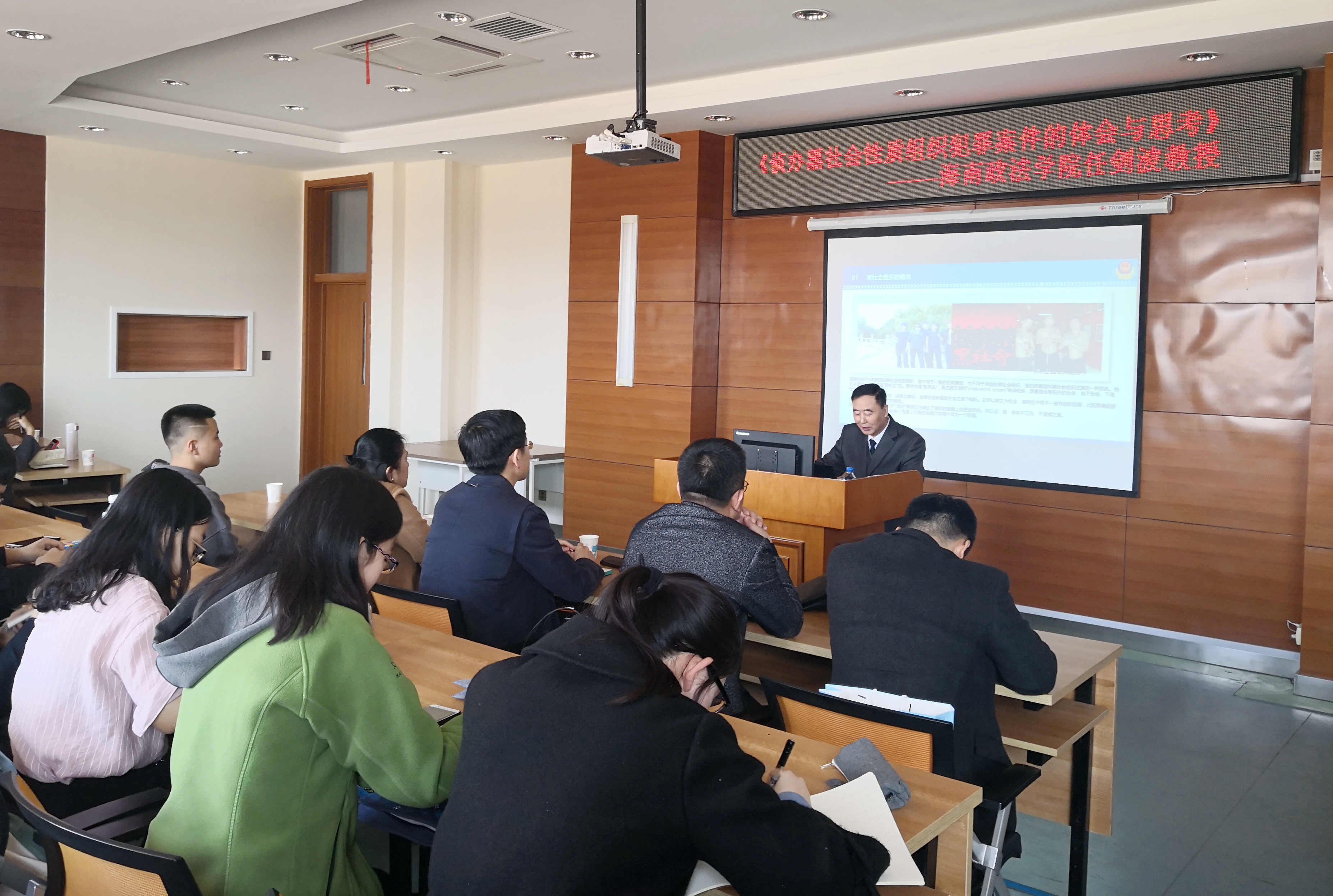 讲座中,任剑波教授重点对黑社会组织概念、黑社会性质犯罪成因、特点及发展趋势进行了解析,并对“打黑除恶到扫黑除恶”的历史变革以及侦办黑社会性质组织犯罪对策和体会等方面进行了详细解读。结合当下“扫黑除恶”工作,任教授用8个案例深度剖析了“扫黑除恶”的重要性,并从实践经验出发,逐步对黑社会新样态与案件侦查、刑法规制等问题与同学们进行了探讨交流。