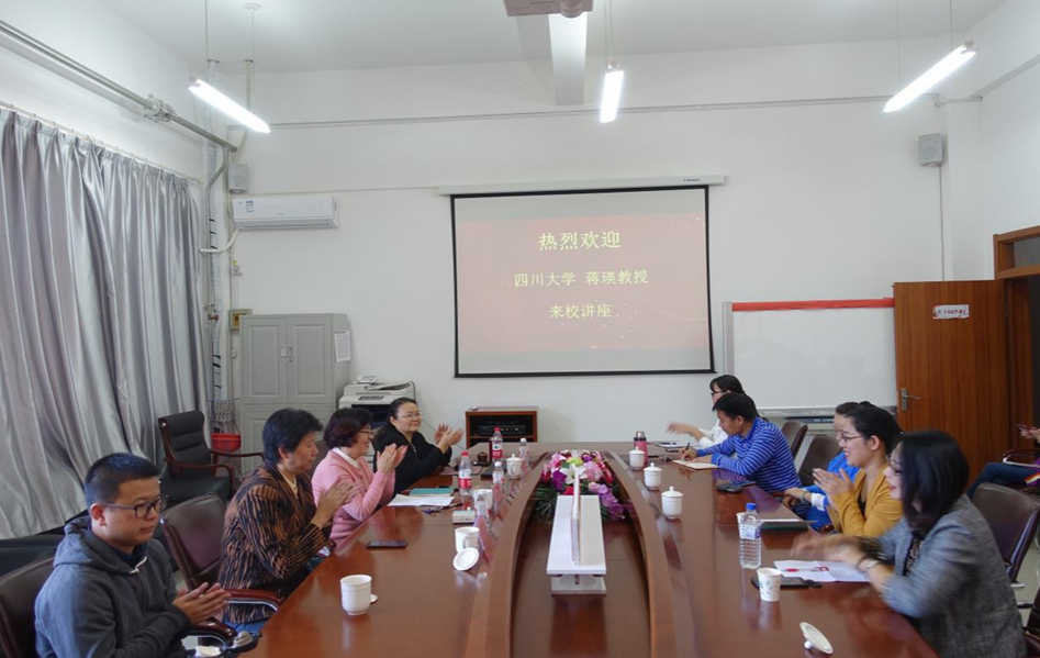 在报告会上,王云凤院长首先代表学院致辞。蒋瑛教授结合目前国家改革及发展规划的要求,作了题为“双一流高校外向型创新创业人才培养研究——以四川大学为例”的学术报告。蒋教授介绍了外向型创新创业人才培养的必要性及其研究意义,其中以四川大学的教学过程为例,重点阐释了培养外向型创新创业人才的目标在于培养大批具有国际视野、通晓国际规则、能够参与国际事务和国际竞争的国际化人才。