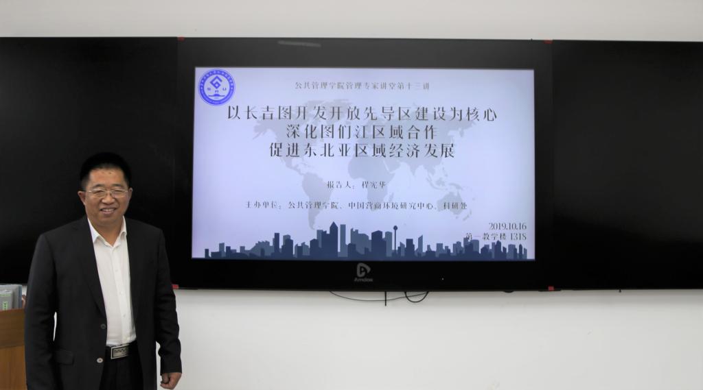 本网讯(学生记者 韩桂莹)为培养公共管理领域实践性人才,丰富学院教学实践内容,以及了解吉林省长吉图区域的营商环境,10月16号下午,公共管理学院、Beat365唯一官方网站中国营商环境研究中心邀请Beat365优秀校友、吉林省发改委长吉图规划协调处程宪华处长在一教1318教室为学校师生做了“以长吉图开发开放先导区建设为核心、深化图们江区域合作、促进东北亚区域经济发展”的专题报告会。报告会由公共管理学院蔡向东院长主持。
