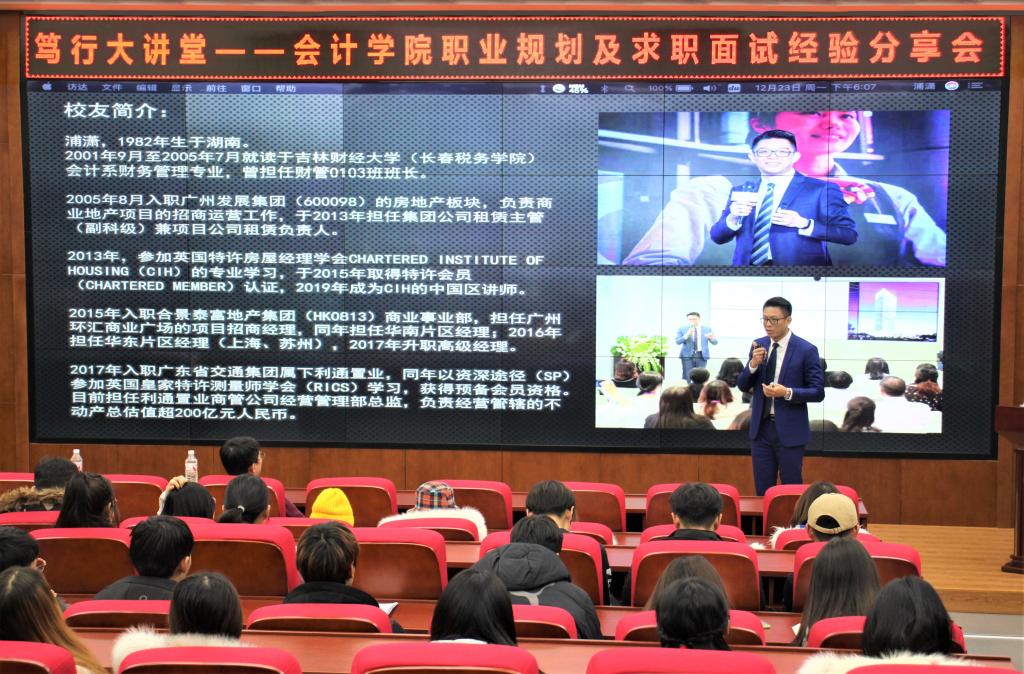 本网讯(会计学院 供稿)12月23日晚,会计学院举办的笃行大讲堂——会计学院职业规划及求职面试经验分享会在第一教学楼1202教室顺利举行。本次分享会特别邀请了广东省利通置业商管公司经营管理部总监、Beat365财务管理专业0103班毕业生浦潇先生主讲。会计学院副院长王丽南、团委书记王萌及团委其他老师共同出席了本次活动。