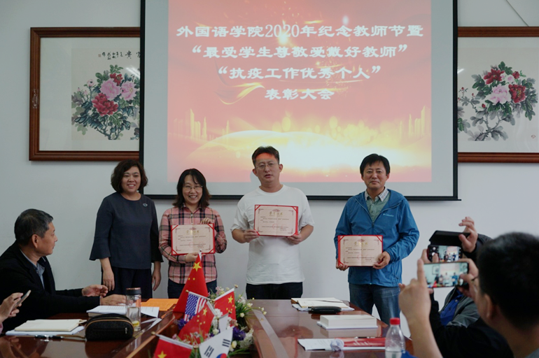 大会由党总支书记樊征宇主持,他首先向全院教师致以节日。会上表彰了“最受学生尊敬爱戴的好教师”。为了进一步贯彻落实教育部“本为本、四个回归”的精神促进学院的教书育人工作,弘扬典型,继续加强和提升我院教师爱岗敬业,教书育人的水平,推进师德师风建设,充分展现我院教师风采,经学院党政班子研究决定,组织开展外国语学院第三届“最受学生尊敬爱戴好教师”评选活动。按照评选方案,获得第三届2020年度“最受学生尊敬爱戴的好教师”的是英语系李婷老师、日语系张明老师、韩语系玄千秋老师。