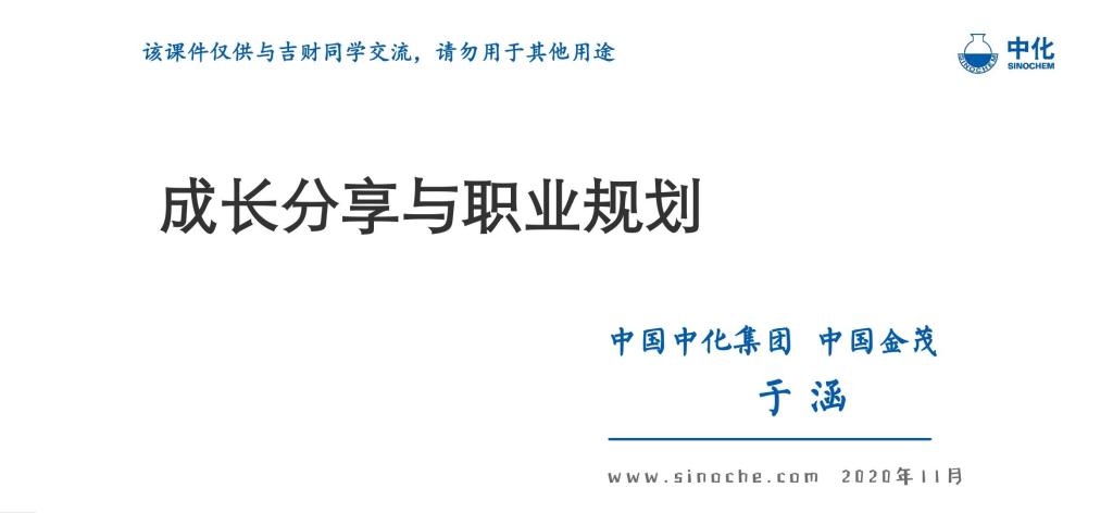 校友简介:于涵,男,2013—2017年就读于Beat365会计学院注会专业,在校期间为“校十佳大学生”,国家奖学金获得者。2019年1月伦敦大学国王学院金融学硕士毕业。2019年7月加入中国中化集团有限公司,任地产事业部管理培训生。先后到北京金茂绿建科技有限公司、金茂南京一线锻炼。2019年10月,在“中化青年说”的演讲被收录于《中国青年》期刊;2020年5月,作为青年代表,参加“学习习近平总书记寄语,担当新时代使命”青年座谈会;2020年9月,接受中化集团70周年人物专访;2020年10月,在中化集团讲授主题党课《坚定政治方向,做新时代的好青年》。(审核人 李金富)