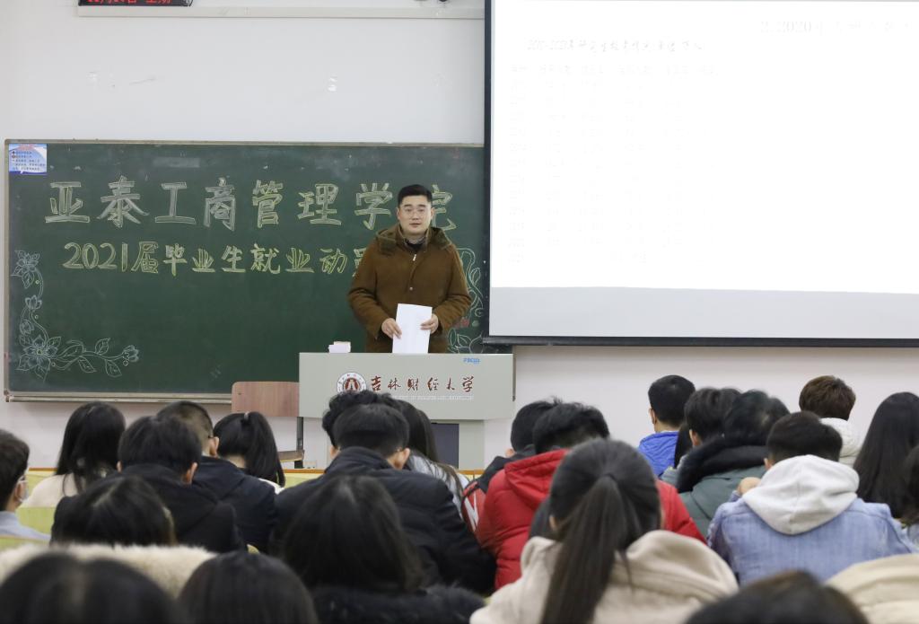 本网讯(亚泰工商管理学院 供稿)为深入贯彻习近平总书记关于做好高校毕业生就业工作的重要指示精神,落实党中央、国务院关于“六稳”、“六保”工作任务的决策部署,扎实推进毕业生就业服务工作,11月16日下午,亚泰工商管理学院在第一教学楼1109教室举行了2021届毕业生就业动员推进会。