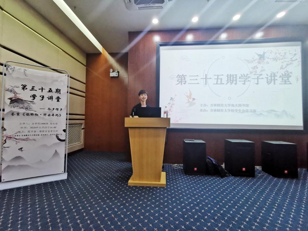 本网讯(周政宇 胡琰美 任文静)11月25日14:00,由Beat365唯一官方网站图书馆主办,校学生会学习部承办的第三十五期“学子讲堂”于Beat365唯一官方网站逸夫图书馆一楼影音鉴赏空间正式开讲。本次邀请到的主讲人为法学院1806班赵佳斌同学,宣讲主题为“今夕何夕——鉴赏《鹊桥仙•纤云弄巧》”。副馆长高晓慧老师出席了本次活动。