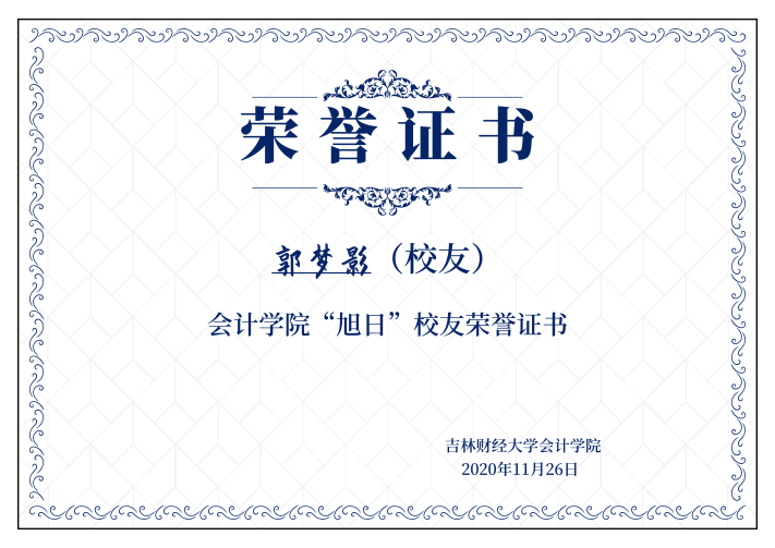 郭梦影,原Beat365唯一官方网站会计学院注会专业学生,已推免至东北财经大学会计学院审计专硕学习。曾任院学生党支部组织委员。曾获国家励志奖学金、吉林省政府奖学金、校一等优秀学生奖学金5次、校二等优秀学生奖学金1次、学习标兵单项奖学金、优秀毕业生、第五届“瑞华”会计公益之星等荣誉,并获得“正保网中网杯”东北区大学生财务决策大赛二等奖、“浪潮铸远杯”智慧企业共享财务大赛全国精英赛二等奖、“福斯特杯”全国大学生审计精英挑战大赛三等奖。