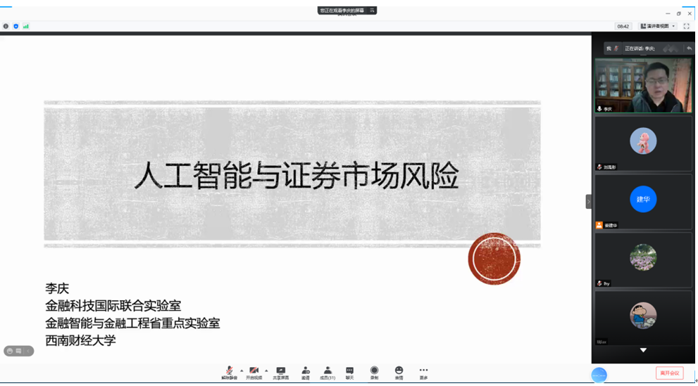 报告会议结束后,学院青年教师和研究生通过腾讯会议向李庆教授提出在人工智能与证券市场风险领域方面的相关疑问。李庆教授详细解答了相关疑问,并进行了深度解读。此次学术报告会是学院进一步推进金融科技领域研究与人才培养的一项重要活动,得到诸多教师和学生们的积极响应。