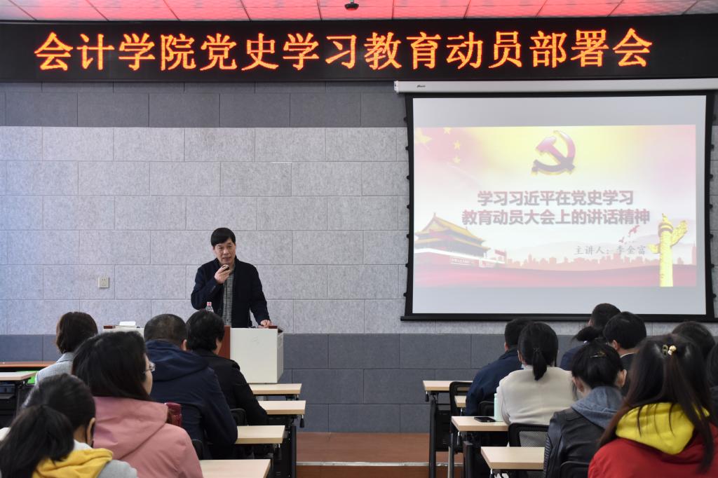 会上,李金富书记做了动员讲话。他首先传达了习近平总书记在党史学习教育动员会上的讲话精神以及学校党史学习教育动员部署会的会议精神,接着宣读了《会计学院党史学习教育实施方案》的具体安排和工作要求。并指出要深刻认识开展党史学习教育的重大意义,在全党开展党史学习教育,是以习近平同志为核心的党中央立足党的百年历史新起点、统筹“两个大局”、激励全党全国各族人民满怀信心投身全面建设社会主义现代化国家作出的重大决策,也是学院加快推进“双一流”建设的必然要求。要在教育中引导党员真正做到学史明理、学史增信、学史崇德、学史力行,实现学党史、悟思想、办实事、开新局的预期目标。