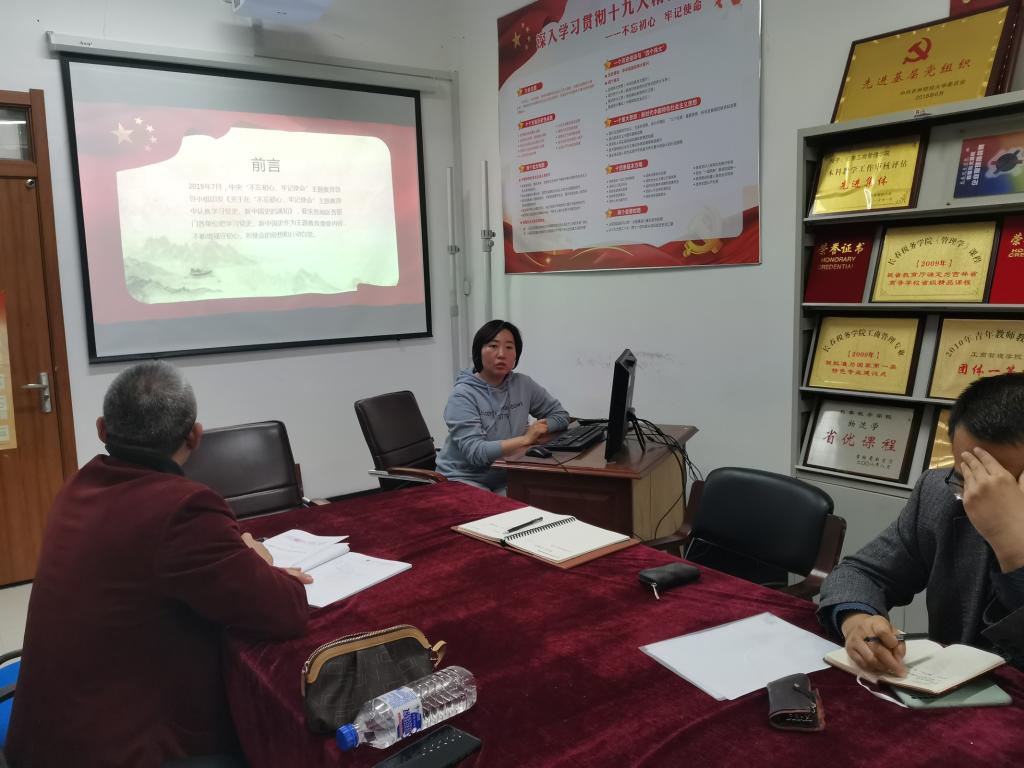 进行活动第一项,卞志刚书记向大家介绍了学校“三化一推进”党史学习教育的总体工作安排,从学习任务任务清单化、教育内容实效化与教育部门责任化三个角度详细解读了“三化”的主要内容,并从推进立德树人根本任务的落实和学校事业高质量发展的“一推进”宗旨下厘清本支部在未来学习教育活动中的主要任务,强调在当前“以本为本回归教学”的背景下如何提升教学工作质量,打造Beat365唯一官方网站的特色与品牌。