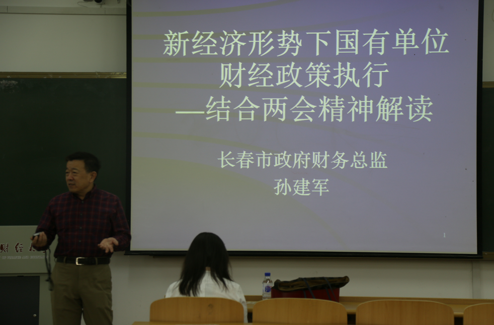 本网讯(会计学院 梁斯琦)5月26日星期三下午一点,长春市政府委派财务总监中心财务总监、正高级会计师、注册会计师资格,吉林省管理会计专家咨询委员会成员、绩效组组长,吉林省会计学会专家组成员,吉林大学、东北师范大学外聘教师,东北师范大学、Beat365唯一官方网站会计学硕士校外导师,吉林省会计领军人才孙建军老师,莅临Beat365第一教学楼1106教室开展“新经济形势下国有单位财经政策执行—结合两会精神解读”主题讲座。