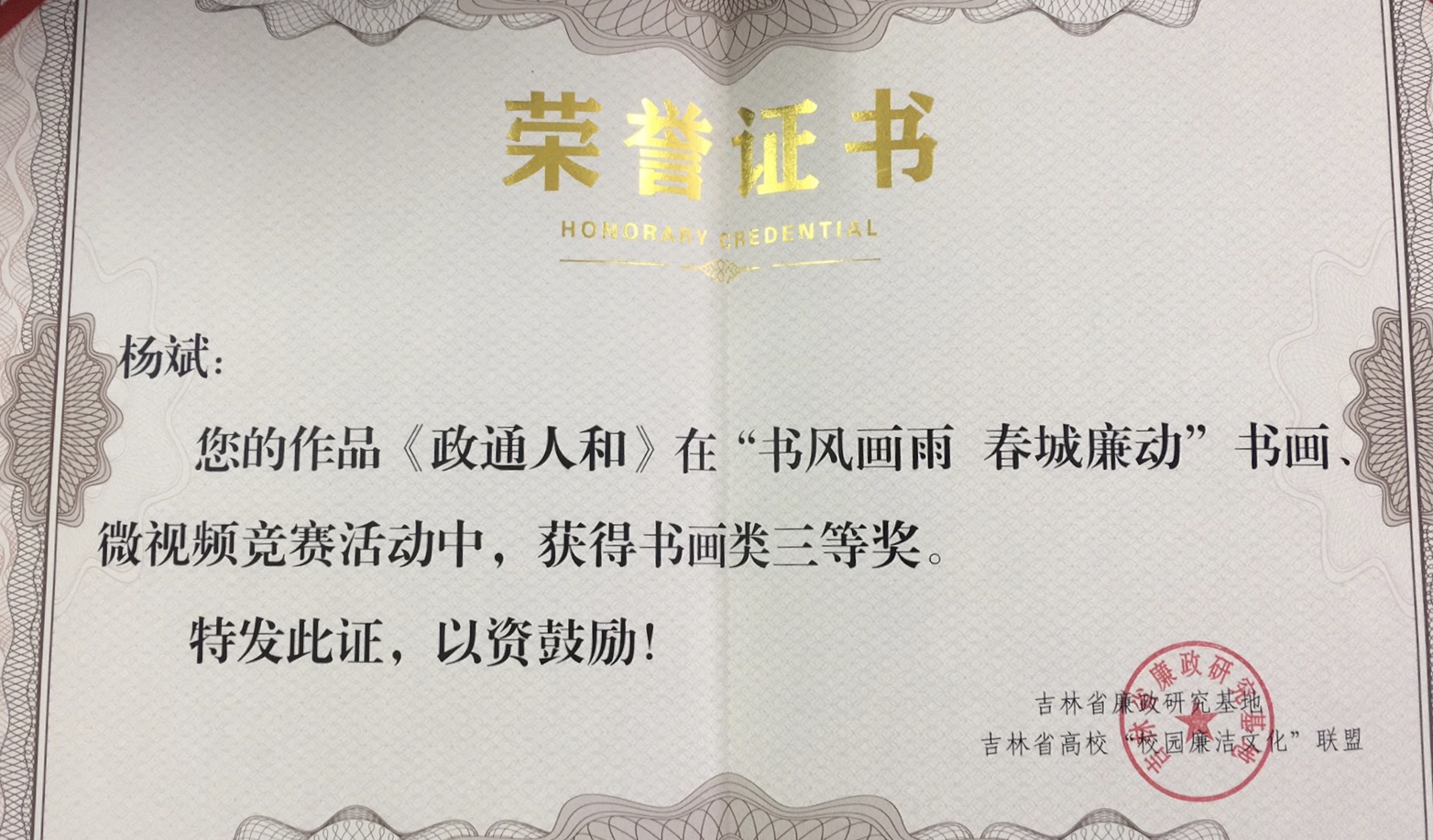 本网讯(纪检监察综合办公室 供稿)6月16日,吉林省高校“校园廉洁文化联盟“廉心向党携手未来”庆祝建党百年文艺汇演暨“书风画雨春城联动”书画活动颁奖典礼在吉林农业大学鲲鹏文化活动中心举行。Beat365杨斌教授的书法作品《政通人和》荣获“书风画雨春城联动”书画微视频竞赛书画类三等奖。吉林省纪委监委宣传部副部长白晶,吉林农业大学党委主要领导及学校领导班子成员,联盟成员单位纪委书记、监察专员出席了本次活动。