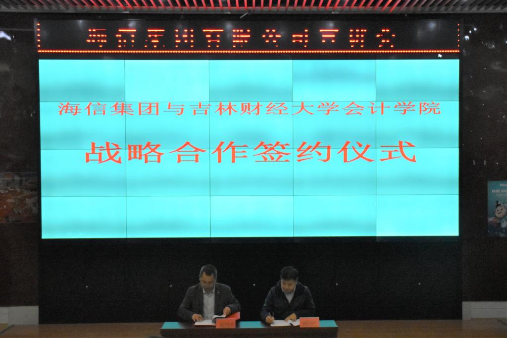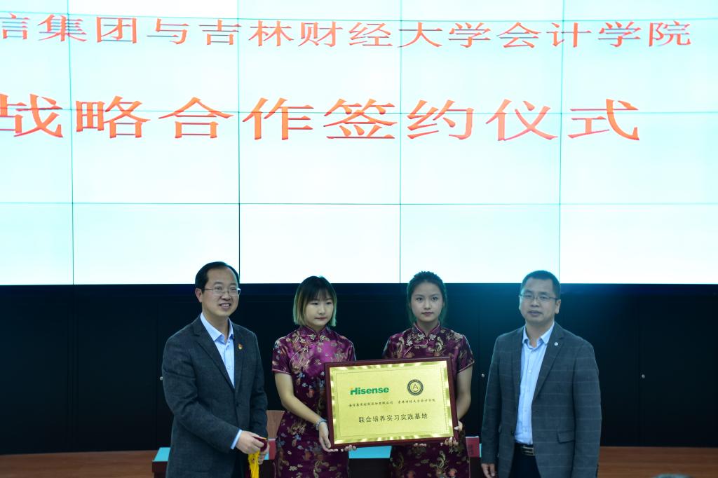 首先,会计学院梁毕明院长与海信集团视像科技财务副总经理杨可多在嘉宾的见证下签署了战略合作协议,紧接着,学校招就处陈德民处长与杨可多副总为联合培养实习实践基地进行了揭牌。