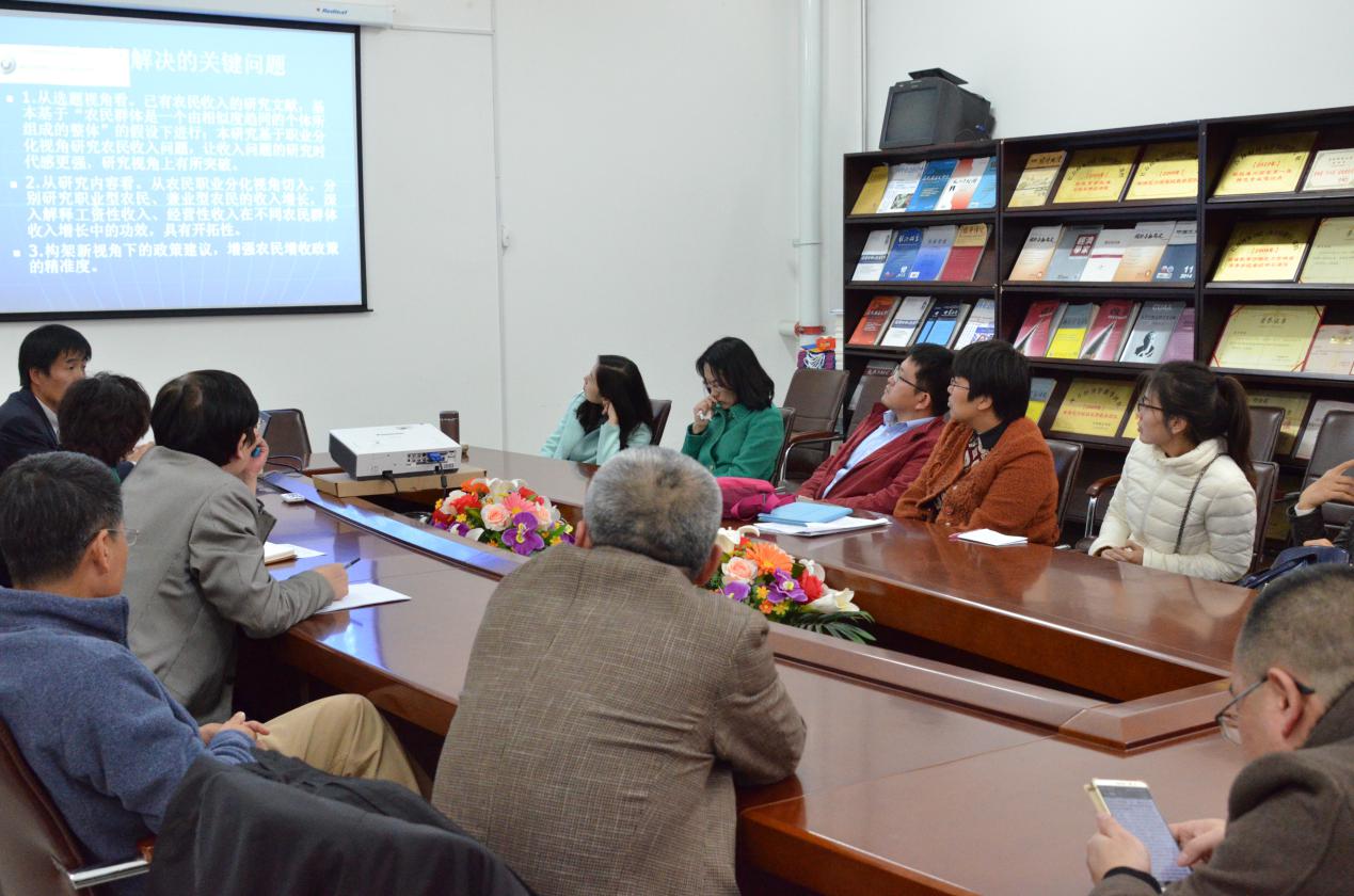 首先,蔡向东老师致开场词,介绍了我院近几年来科研工作的突出成绩,并鼓励老师扎实开展学术研究、努力创作高水平学术成果,学院也将尽可能地对大家的学术科研给予多方面的支持。2016年度公共管理学院获得立项纵向项目(含校级项目)共计4项,其中劳动与社会保障教研室吴德帅老师申报的课题《福利权与社会阶层交互作用机制研究——以吉林省为例》获校级青年基金项目立项;金京淑老师课题《吉林省城乡统一建设用地构建及利益分配关系研究》作为省教育厅重点项目立;阎宇老师课题《吉林省公共教育服务均等化研究》和蔡向东《吉林省农村集体互助养老模式可持续性问题研究》获得了省社科立项。