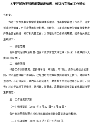 2024年1月,教务处组织开展人才培养方案和教学大纲的修订工作,修订重点是落实以学为中心和产出导向理念,对标专业人才培养类型(研究型/应用型)、专业人才培养培养目标和毕业要求,力争在大纲中体现专业的前沿理论、知识和技术,突出课程特色。两项工作预计完成时间在2024年5月中旬。