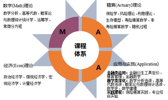 专业构建了具有交叉融合性的“数学-精算-经济”必修课程体系。选修课程体系分为“金融类应用”和“数学类深化”两个方向,以适应不同学生的兴趣和职业发展规划。该课程体系不仅注重理论知识的学习,还强调实际应用能力的培养,使学生在保险精算领域具备扎实的基础和广泛地应用能力。