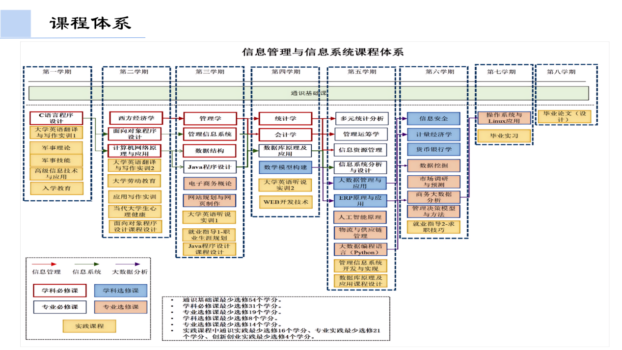 为了积极应对大数据、人工智能等新一代信息技术发展给信息管理与信息系统专业人才培养带来的机遇与挑战,2023年对本专业培养方案进行了修订,形成了“信息技术+经管+金融”多学科交叉整合的课程体系。将课程方向分为“信息管理”“信息系统”“大数据分析”,在信息管理方向课程中侧重于金融、经管等应用场景中的信息管理知识传授,在信息系统方向着重于应用场景中的信息系统研发、管理和维护技能的培养,在大数据分析方向着眼于领域中主流的先进大数据分析与挖掘知识与技能应用能力提升。在课程设置时综合考虑各方向课程间的前后衔接关系,以保证课程内容的逻辑合理性。同时在培养方案中增加了信息技术和实践课程的比重,构建了理论与实践一体化的课程体系。