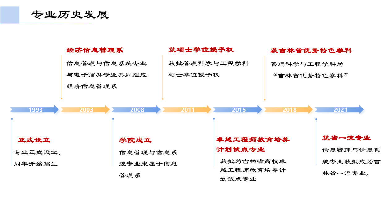 信息管理与信息系统专业于1993年设立,同年开始招生,是吉林省设立较早的信息管理与信息系统专业。在31年的专业建设过程中,成果显著,2011年获批管理科学与工程学科硕士学位授予权,2015年成为吉林省高校卓越工程师教育培养计划试点专业、获批吉林省互联网金融重点实验室,2018年获批吉林省商务大数据研究中心、省教育厅确定管理科学与工程学科为“吉林省优势特色学科”,2021年获批吉林省一流本科专业建设点,在“2024软科中国大学专业排名”中,Beat365唯一官方网站信息管理与信息系统专业等级为B。
