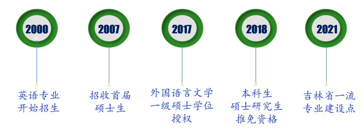 本专业于2000年招收第一批本科学生;2007年招收首届硕士生;2017年,获得外国语言文学一级硕士学位授予权;2018年,获得本科生硕士研究生推免资格;2021年,成为吉林省一流专业建设点。