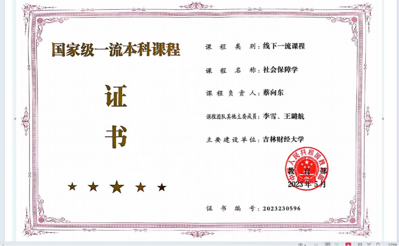 在课程建设方面,2019年,《社会保险》课程被评为“校级课程思政教学改革示范项目”。2020年,《劳动争议案例分析》被评为“校级一流课程”。《社会保障学》被评为“省级线下一流课程”。2022年,《社会保障学》被评为国家一流本科课程,形成国家级、省级与校级三梯队品牌课程,打造了专业素养和创新意识强的教学团队。