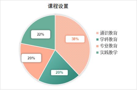 课程设置主要包括四大模块,第一部分为通识教育模块-德智体美劳全面发展,总学分占比38%;第二部分为学科教育模块-意在拓宽学科视野,占比20%;第三部分为专业教育模块-夯实基础理论,占比20%;第四部分为实践教育模块-旨在提高学生实操能力,占比22%。
