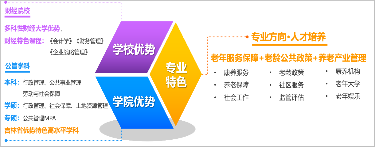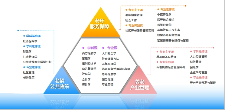 本专业以立德树人为根本任务,瞄准当前及未来国家和社会对养老服务管理人才的需求,依托学院公共管理学科及相关专业的建设基础并充分发挥财经类大学的专业特色优势,整合专业优质师资力量,围绕养老服务管理人才应具备的理论知识和能力素养,打造以“老年服务保障+老龄公共政策+养老产业管理”为基本框架的课程体系,实现“厚基础、精专业、多方向、重实践”的专业人才培养。