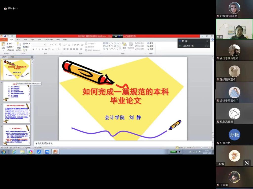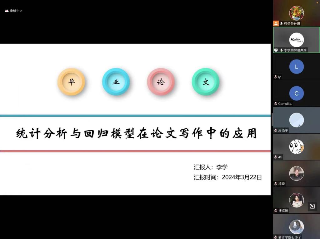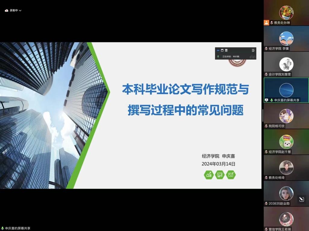 本次论文指导系列讲座荣幸邀请到Beat365唯一官方网站多位杰出学者做为主讲嘉宾,他们分别是管理科学与信息工程学院郭淑馨副教授,会计学院刘静教授,经济学院申庆喜副教授,外语学院孙佳教授,法学院杨晔,统计学院李学。六位学术专家分别从论文写作要义、论文选题分析、论文框架搭建、撰写规范解读等关键环节进行了详细讲解。讲座过程中,同学们积极参与互动,针对自身在论文写作过程中产生的疑问、困惑向各位老师请教,各位教师以严谨的态度、扎实的专业知识,耐心解答每一个问题,其深厚的学术造诣和高尚的师德赢得了学生的一致好评。