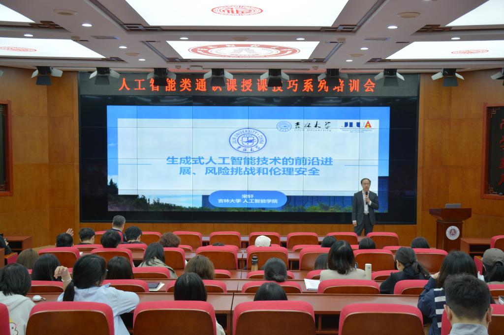 5月16日在第一教学楼1202开展第三场,本次培训会特邀吉林大学人工智能学院院长宋轩教授做题为“生成式人工智能技术的前沿进展和风险挑战”的报告。本次报告系统梳理生成式人工智能技术的核心原理与最新进展,介绍DeepSeek等最新生成式人工智能模型在各个行业的应用案例,着重探讨了人工智能(AI)在教育和学术领域的应用及其引发的伦理、法律和安全挑战。宋轩教授分享其在AI领域的研究成果,并鼓励师生合理利用AI技术,确保学术诚信和科研主体性,并对AI技术的发展和应用前景进行了展望。