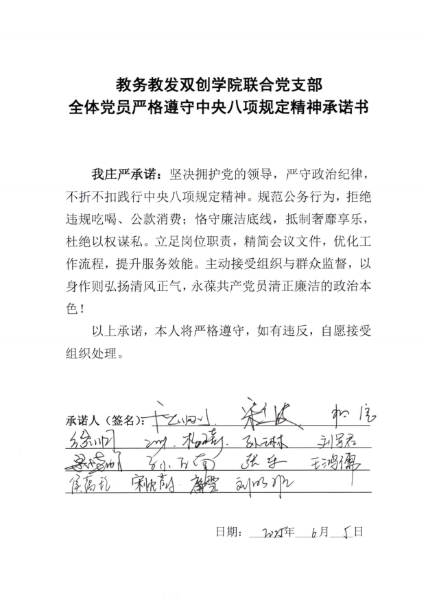 为持续强化纪律作风建设,6月5日,教务教发双创学院联合党支部召开党员大会,围绕违规吃喝专项整治、条例学习及承诺践诺开展专题教育。会议由支部书记刘才主持。
